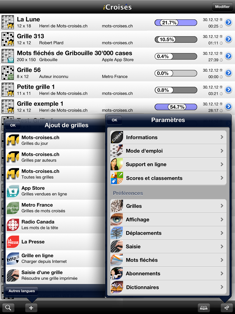 Liste des grilles à l'ouverture de l'application,avec accès à l'ajout de grilles et aux diverses préférences